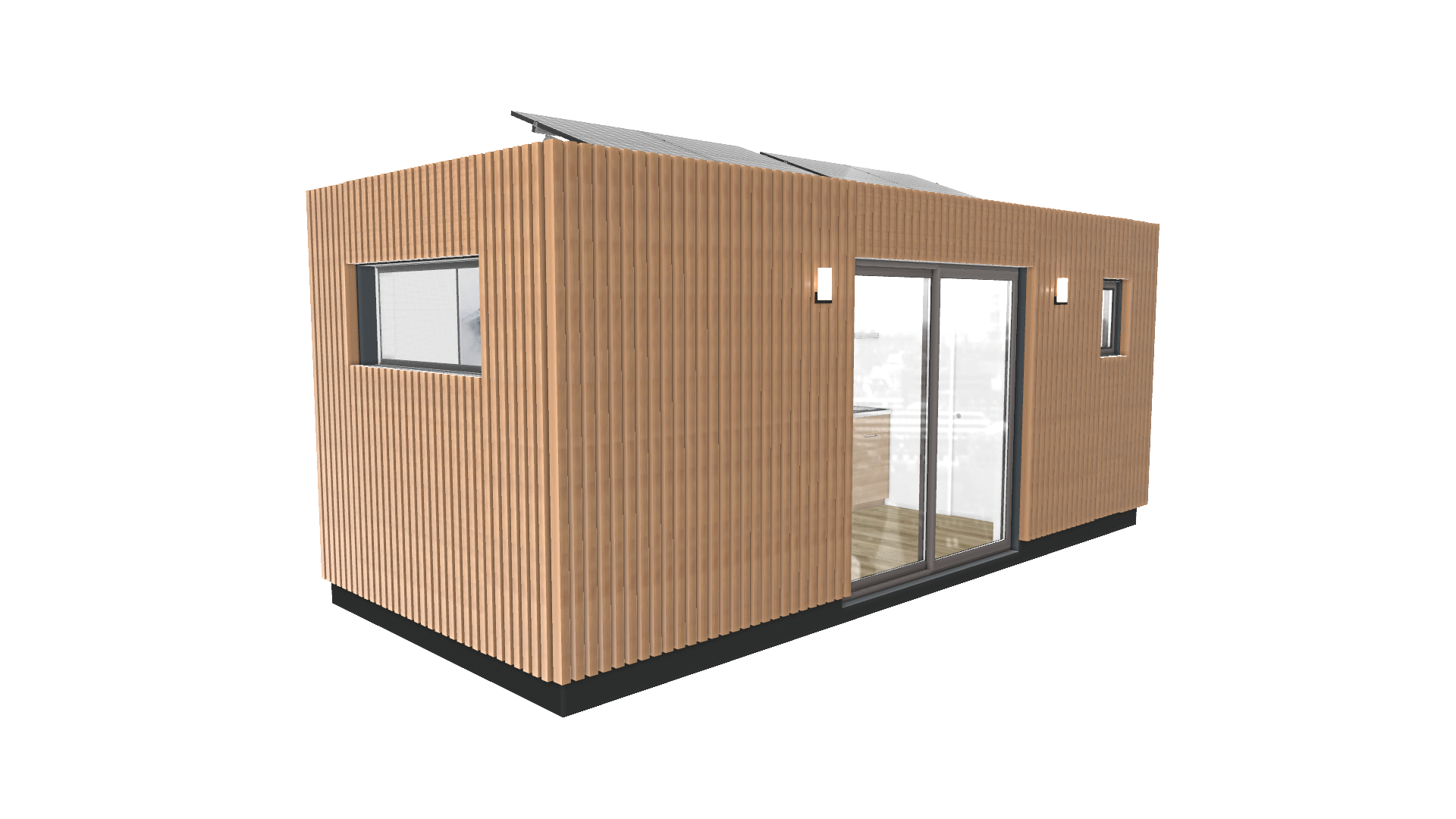 | Fenêtres | En ALU (blanc ou anthracite) avec une baie vitrée coulissante, une fenêtre fixe et une fenêtre 1V OB. |